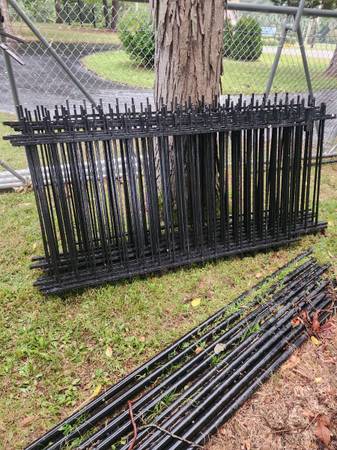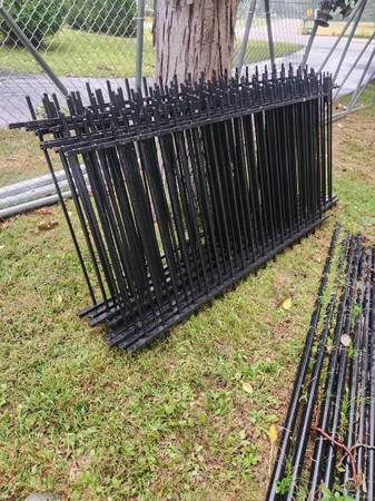 10 steel fence panels with solid pickets 4" spacings, they could be used to create a new fence, replace damaged sections of an existing fence, or even repurposed for other decorative or security applications like window bars.