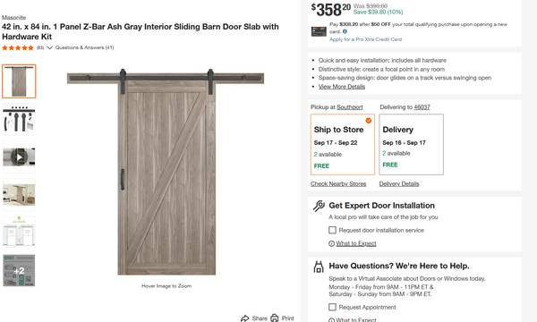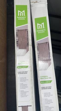 Description: I have 2 brand new Masonite 42 in. x 84 in. Z-Bar Ash Gray Sliding Barn Doors with Hardware Kits – sealed in box. Retail Price: $398 Home Depot Price: $358 My Price: $250 each – save...