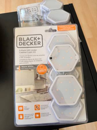 The BLACK+DECKER 5-Puck LED Under Cabinet Light Kit (model LEDUC-PUCK-5WK for warm white or LEDUC-PUCK-5RGB for color-changing) is a compact, wireless lighting solution from BLACK+DECKER's PureOptics LED line, designed for easy illumination under kitchen cabinets, shelves, closets, or workspaces. This plug-in kit features five round puck lights that provide focused, shadow-free accent lighting, ideal for cooking prep, displaying collectibles, or brightening dark corners. Released around 2019, it's popular for its tool-free setup and affordability, making it a go-to for DIY kitchen upgrades or pantry lighting. The warm white version emphasizes cozy illumination, while the RGB variant adds fun color options via remote control.