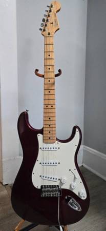 Fender Stratocaster, Made in Mexico (early 2000s). Classic Strat setup with 3 single-coil pickups, 5-way selector, maple neck and fretboard. Finish is Midnight Wine (dark red/burgundy).