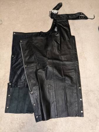 Men's cowhide leather chaps, size XXL (but seems to be closer to XL). Gather in the thighs with lacing in back and a leather belt with a roller buckle for best fit. These are new with all the tags (I had to give up riding before using). The online price is $120...I'm selling for $75.