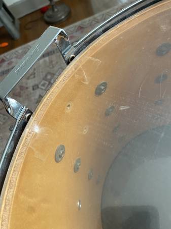 Made in the good old Slingerland days, this is a really cool drum! 15x12 with 12 lugs, all hoops, lugs, and tension rods are present and fully functional. The snare mechanism was broken so I took it off in hopes of eventually replacing it but never did. One could easily mount another snare strainer on it, the holes match up for the old school Ludwig type strainers. I do have the original snares that came on it as well.