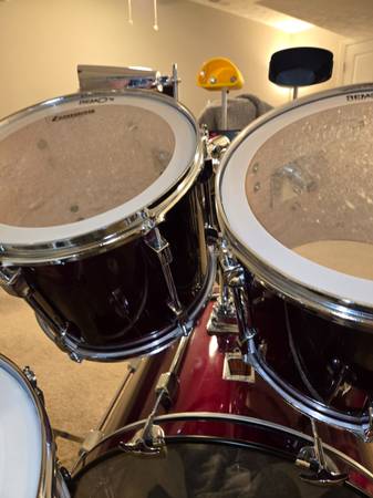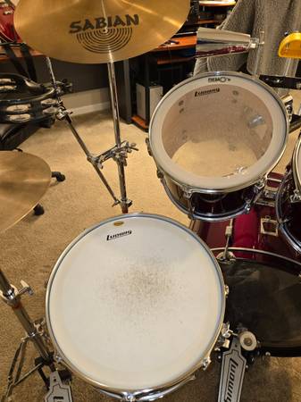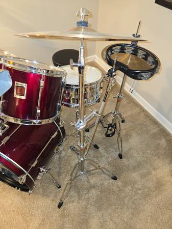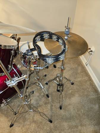 Purchased this new for recording in my home studio. Tried learning but found out I am not a drummer (LOL) and ended up using drum machines instead. These have not been played more than 20 hours over their lifetime. Everything is in excellent shape. Have always kept it clean in my smoke/pet free home. Downsizing, so now these need to go. Everything except throne is included as shown in photos. The cymbals are all excellent sounding high quality Sabian AAX without any dings, cracks, bends, or scratches. 20" ride, 14" high hats, 16" stage crash and 16" dark crash. Also have mounted tambourine, 2 bells, and a block. All you need in one package. Price is firm. Cash only. Will not separate or sell any items individually. You are welcome to try before buy, but serious inquires only please. Thanks for looking!