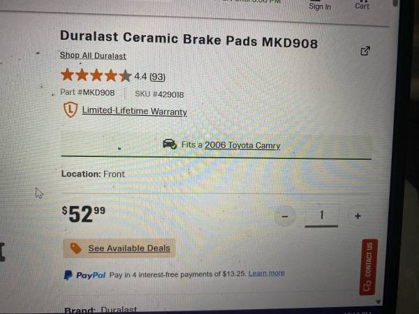 Cash Only No Shipping Great Deal $60 (Front and Rear) NEW Camry 2006 Ceramic Front and Rear Brake Pads Duralast Part Number: MKD908 (Front) Part Number: MKD828 (Rear) Note: These brake pads also fit...