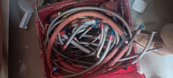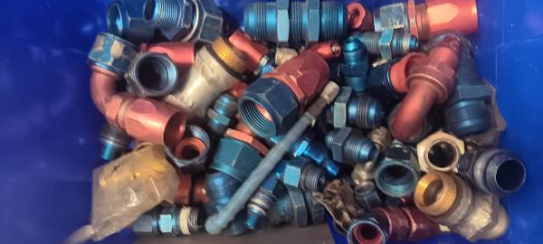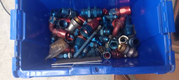 Big tote of AN Hose, some made up, bunch of new lengths down low. Another tote full of misc fittings 3-16.
