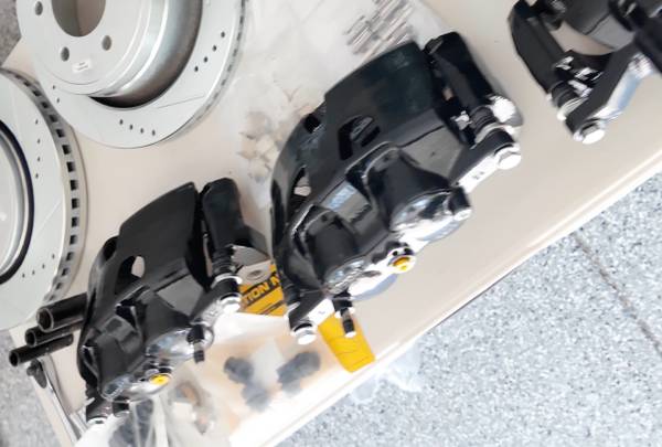Brand new in box are a set of PowerStop drill and slotted rotors with rear gloss black powder coated calipers for a 2015-2020 Ford F150. This is a $650 value!