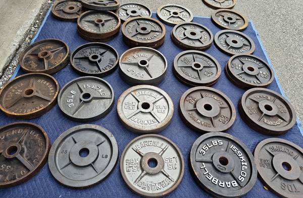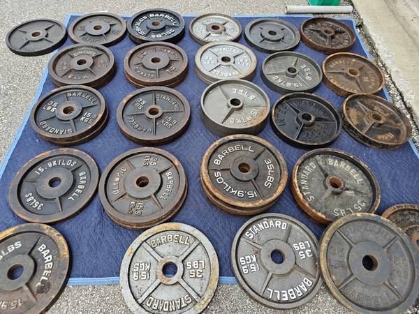 Search terms: Olympic weight plates, 35 lb plates, steel plates, home gym gear, strength training, used fitness equipment, garage gym, barbell weights, lifting plates