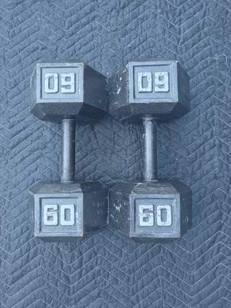 Heavy-duty 60-pound hex dumbbells built for strength training. Solid cast construction with grey heads and knurled handles for secure grip.
