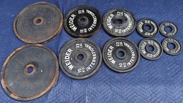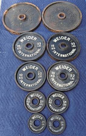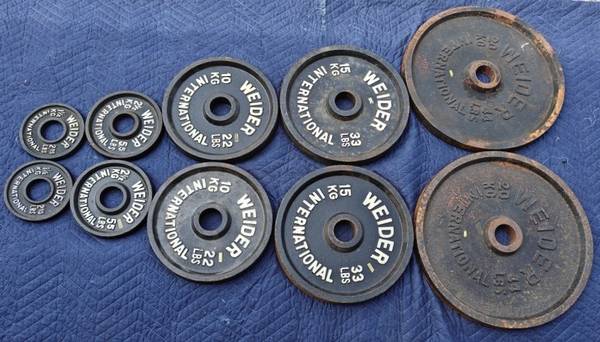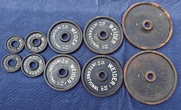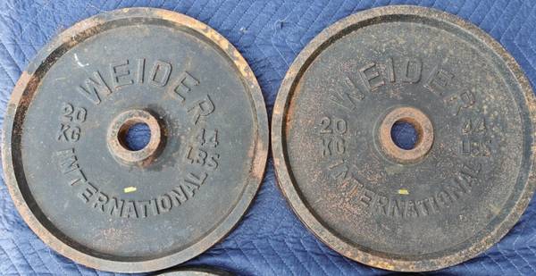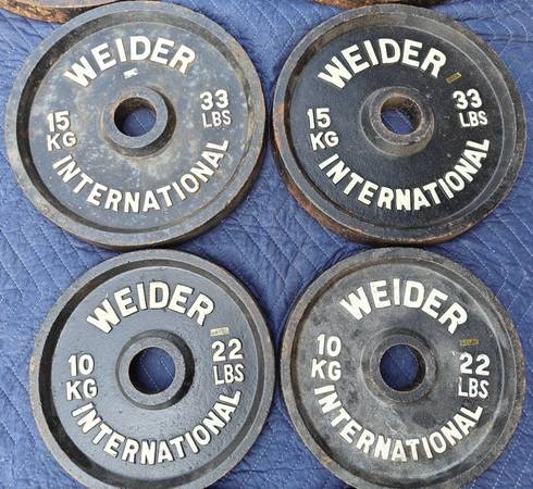 Search terms: Weider weight plates, Olympic plates, vintage gym gear, dual-marked plates, strength training equipment, home gym setup, barbell weights, used fitness gear