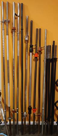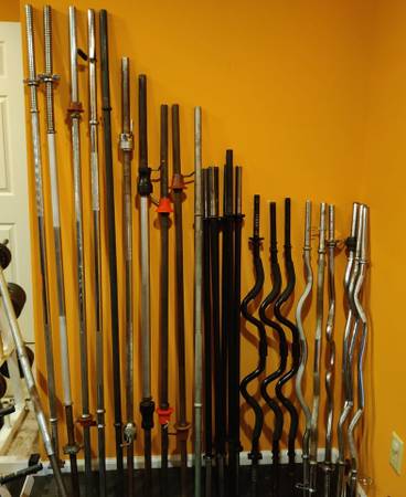 Collection of standard size 1" sleeve bars for home gyms and strength training setups. Includes straight and curl bars in various lengths and builds. All bars are compatible with standard 1" weight plates. Lightly used, fully functional, and priced to move.