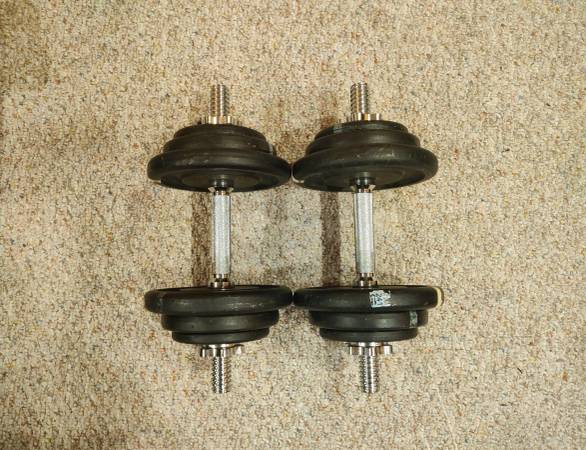 adjustable dumbbells, dumbbell set, standard dumbbells, 1 inch plates, dumbbell handles, spin-lock dumbbells, spring collar dumbbells, home gym equipment, strength training, fitness weights, resistance training, personal training gear, compact gym gear, beginner weights, rehab equipment, workout gear, build your own dumbbells, weight plate set, dumbbell components, free weights, fitness gear, local pickup Carmel, Zionsville fitness, Marketplace fitness, Indiana gym gear