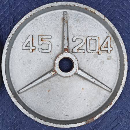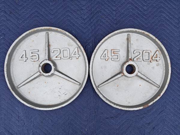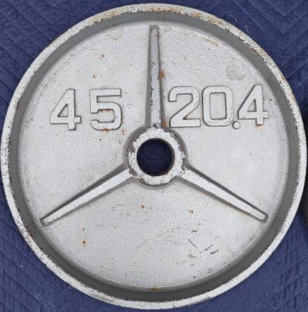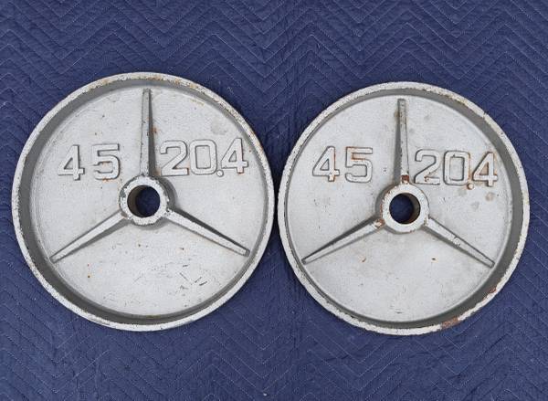 Pair of deep-dish Olympic plates, each weighing 45 LB and featuring a bold tri-spoke design with raised lettering. Constructed from solid cast iron with a recessed center and thick outer rim for easier handling and classic aesthetics. Embossed with β45β and β20.4β markings. These plates are ideal for garage gyms, collectors, or lifters who appreciate old-school gear with functional durability. Fits 2" Olympic barbells.