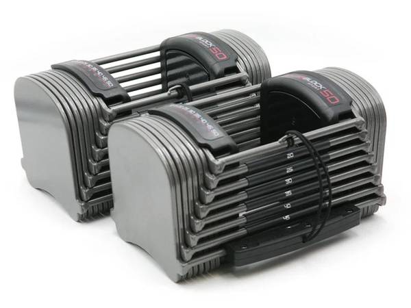 Brand new, unopened set of PowerBlock Sport 50 adjustable dumbbells. Compact, space-saving design replaces 9 pairs of traditional dumbbells (10β50 lb range per hand). Quick-change selector pin makes weight adjustments fast and seamlessβideal for home gyms or tight workout spaces.