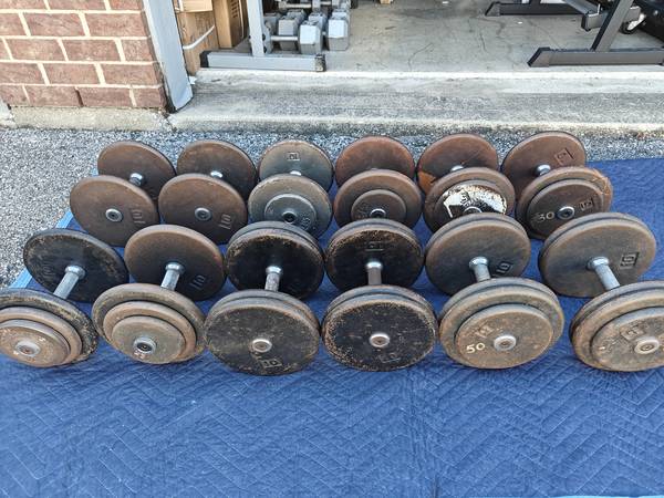 Old-school steel dumbbells with a gritty, no-nonsense feel— weights ranging from 20 to 55 lb. These aren’t polished showroom pieces—they’re the kind of iron that’s earned its scars. Surface rust and aged patina give them a raw, nostalgic edge, but they’re still rock-solid and ready to perform.