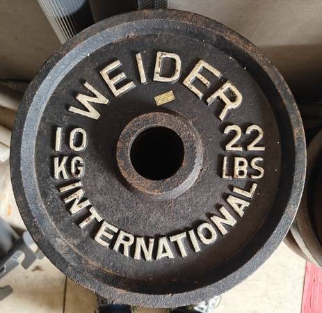 π Search terms: Weider Olympic plates, 22 lb iron plates, 10 kg gym weights, vintage barbell plates, home gym gear, Olympic size weights, strength training equipment
