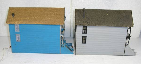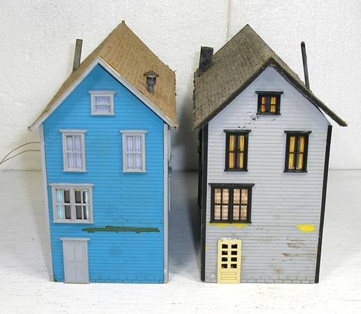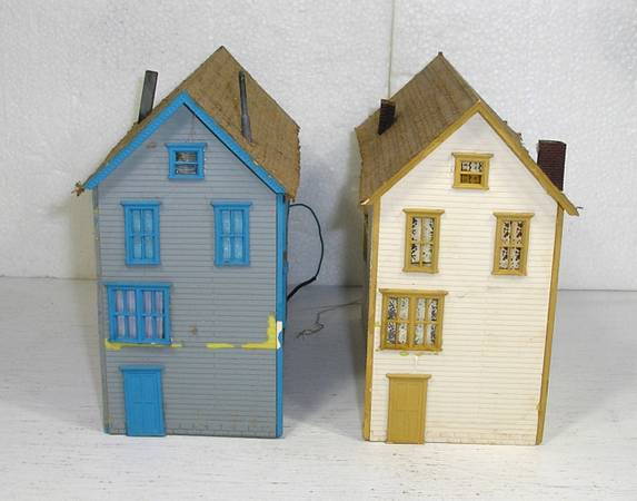 Offering 4 similar HO scale Old Downtown Type 2 Story Row Houses. No boxes or literature. They have been modified to include a porch light – all 4 work. No manufacturer marks.