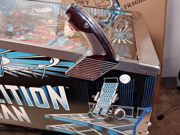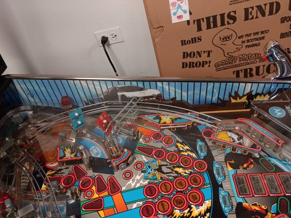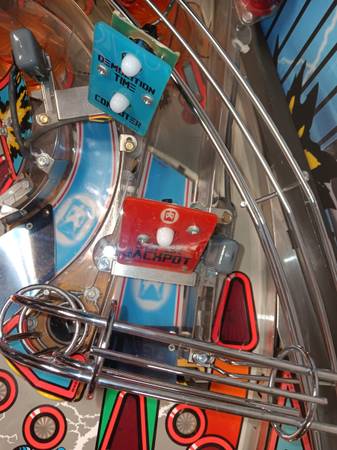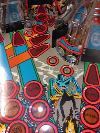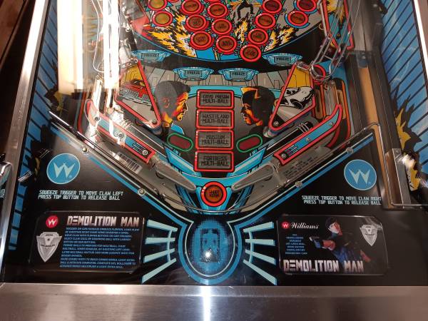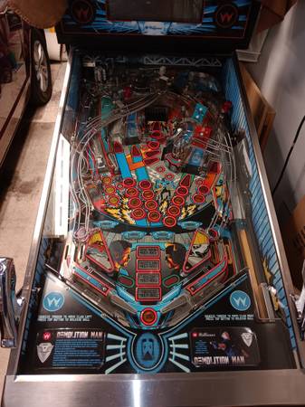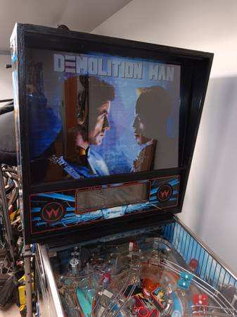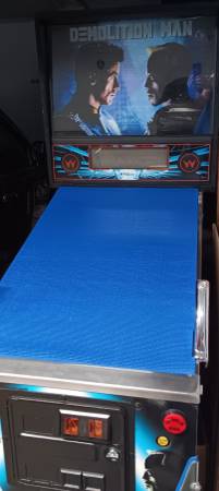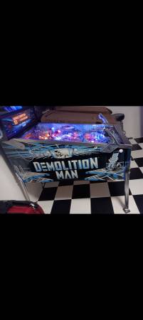 Demolition Man pinball machine excellent condition home use only smoke-free home please see all photo if you're able to zoom in on them zoom in and see how nice it really is the Playfield is covered with mylar and it's home use only that's why it looks brand new replaced the chips to (R) rated Can be turned off or on in the amusement feature you won't be disappointed, you like it make a reasonable offer it may be yours, or trade +/- , Cash and Carry only.