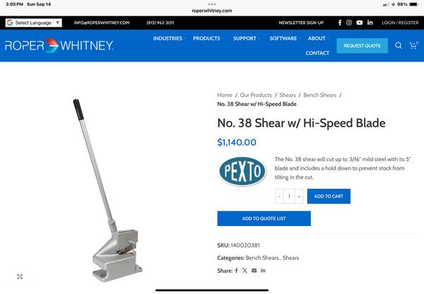 Roper Whitney No. 38 Throatless 3/16” Capacity Metal Fabrication Shear with Handle. $1,140 New Plus Tax and Freight. weighs 50lbs and Has A High Speed Blade On It. Email me if you want it! Pick Up...