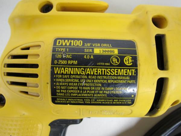 The DEWALT DW100 3/8 inch Pistol Grip VSR Drill is a powerful corded electric drill with a 4.0 Amp motor that delivers 2500 RPM. This heavy-duty drill/driver features a keyed chuck size of 3/8 inch, making it versatile for a variety of tasks. With a compact design measuring 9 inches in length, 8 inches in height, and 2 inches in width, this yellow drill is lightweight at 4.1lbs. It comes with a 7.5-foot cable length and does not include batteries. The DEWALT DW100 model is a reliable and efficient tool for home and workshop projects.