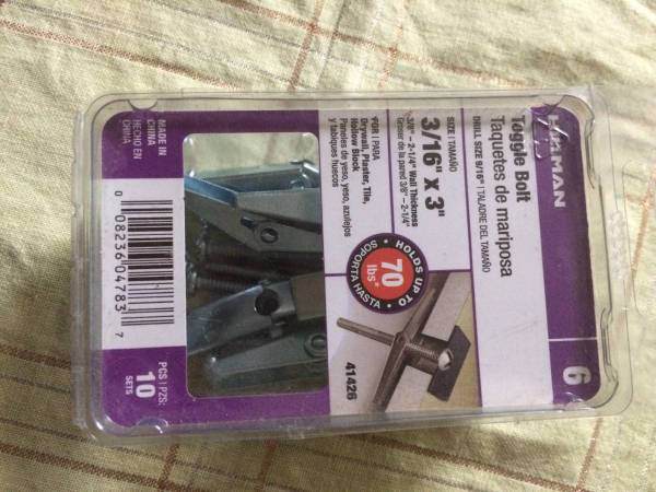 Unopened package of 10 toggle bolts, 3/16 x 3. $2.