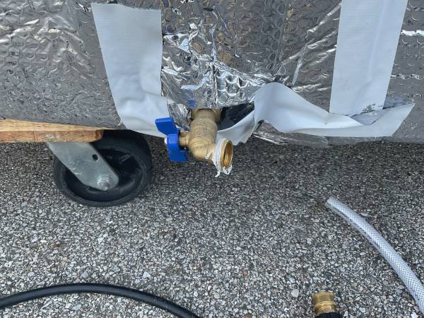 Romtotech, top fill twist lid, heavy duty plastic 100 gallon water tank, insulated (you can remove it if you want to) Near newStandard garden hose brass fitting connection with shut off valve. Comes with Y connection brass fittings that also have shut off valves, a drain hose and pressure wash quick connect. Size is roughly 5ft x 4.5 x 3 ft. Lightweight for being a heavy duty plastic. No leaks, an excellent piece of equipment! Purchased in December 2024 from Tractor Supply Company for my mobile auto detailing business. Paid over $450 new and not including the reinforced mesh drain hose, brass fittings and pressure wash lead. Asking $450 OBO.