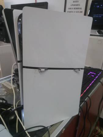 The PS5 slim works great it comes with the controller and the other PS5 will not show video controller not included available by appointment at our shop serious inquiries only not available after 4:00