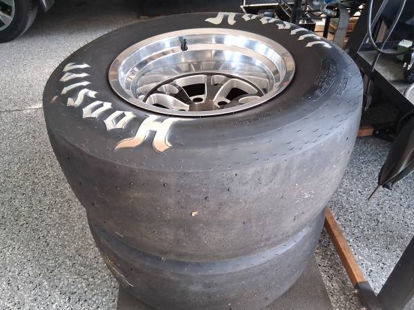 Pair of beautiful Venom, black-polished, aluminum wheels # 10'' w-15in- 4.75 bolt pattern, 5" rear spacing, with two passes old , Hoosier 28.0 by 10.5 drag slicks, compound #C07 like new. Cost over $1200 new. My loss your gain, $800. Pictures available at email address.