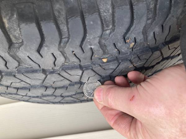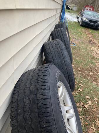 Set a four wheels and tires wheels are in great condition. Tires are usable two are 50% tread and two are 40% tread. They are Goodyear Wrangler RTS 265 7016 they all hold air good they have been stored indoors and climate control some cracking, but not terrible. These tires are very thick day code is 2020. I believe 200 cash for all four wheels and tires no trades no Venmo no checks cash only pick up in Camby Indiana only serious messages only please