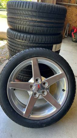 Super Clean C6 wheels with brand new 285/35/19 Michelin rear and 255/40/18 Brigstone fronts, tread matches well. These were for a project car and do not have the sensors in them but are mounted and balanced. Wheels are beautiful polished and really clean in great shape.